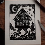 Step into the world of folklore with this Baba Yaga linocut print, featuring the legendary witch’s walking house under a moonlit sky. Wood-carved and printed in rich black ink, this design captures the eerie charm of forest magic—perfect for Halloween lovers, witchy decor enthusiasts, and fans of folklore art.