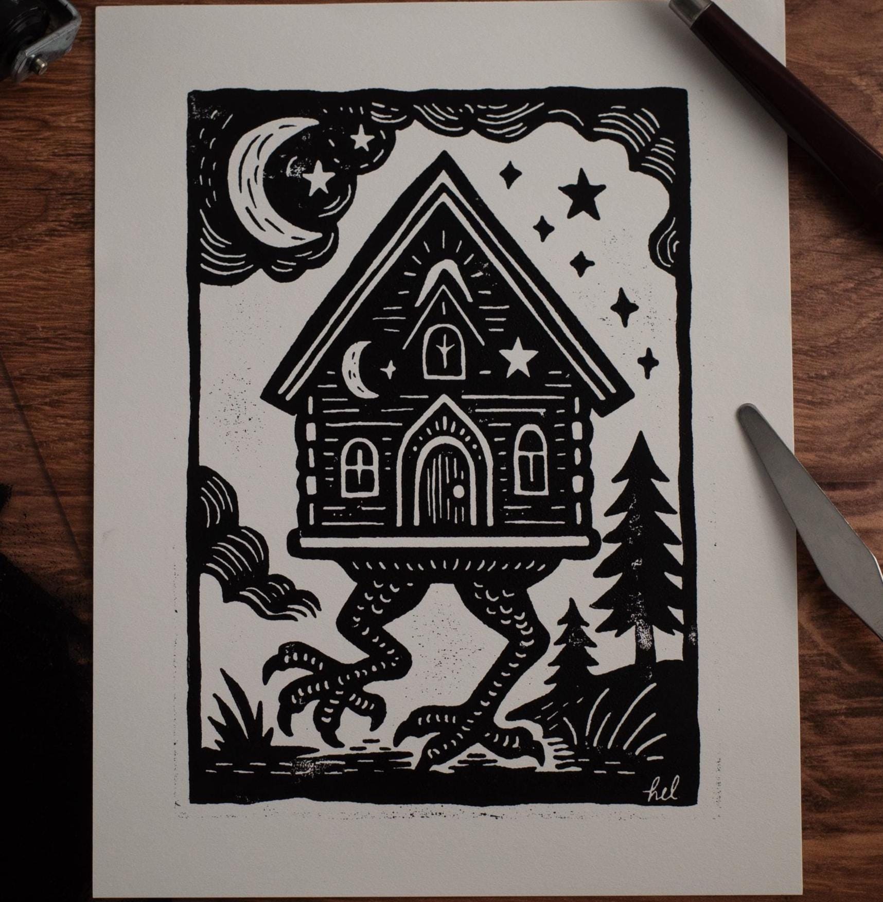 Original product name: Baba Yaga Linocut Print | Spooky Folk Art | Witchy Halloween Wall Decor | 8x10 Black and White Print | Limited Edition of 40