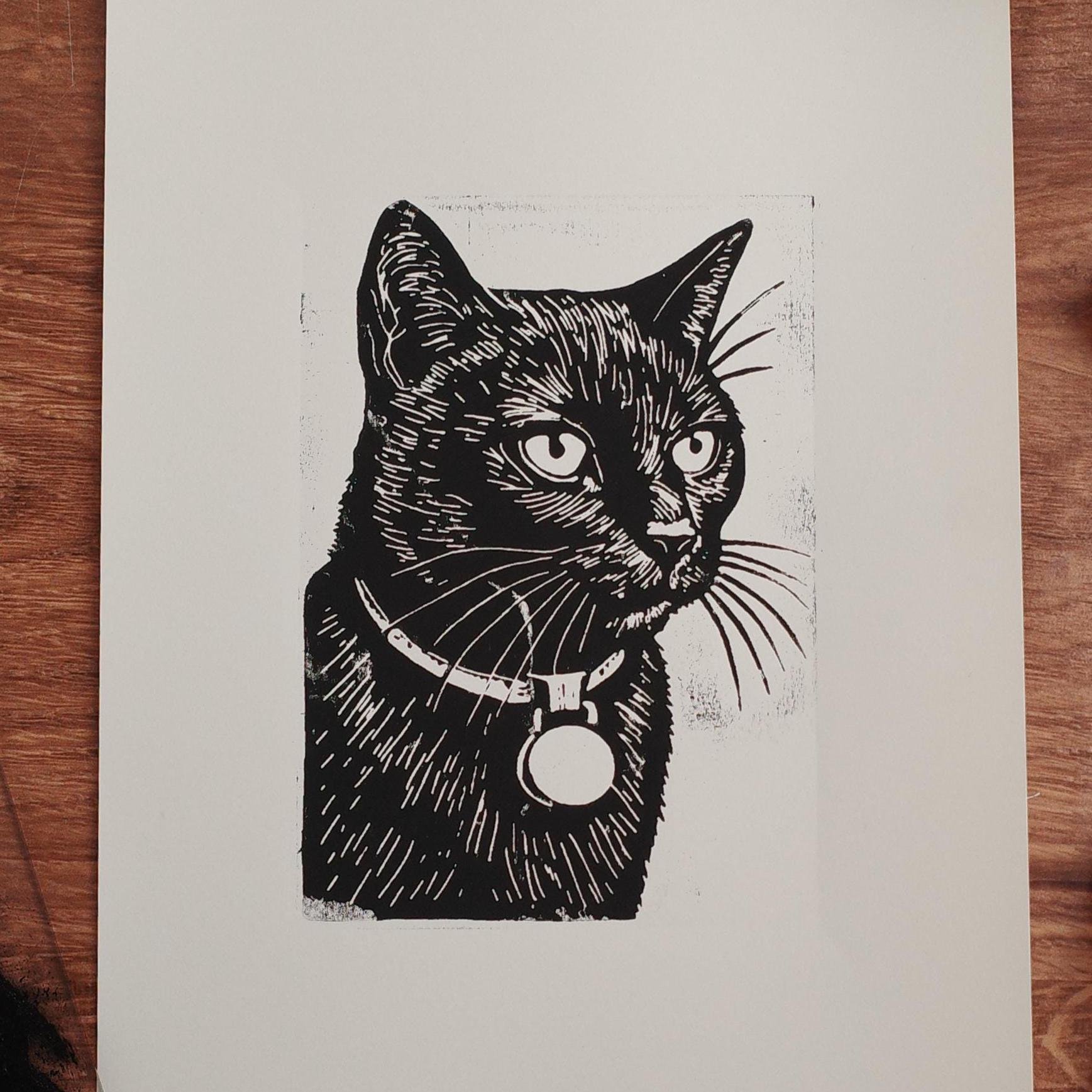 custom cat portrait, cat lover gift, black cat art, hand carved linocut, pet memorial art, cat wall art, personalized cat print, handmade pet portrait, custom pet art, block print cat, minimalist pet decor, cottagecore cat art